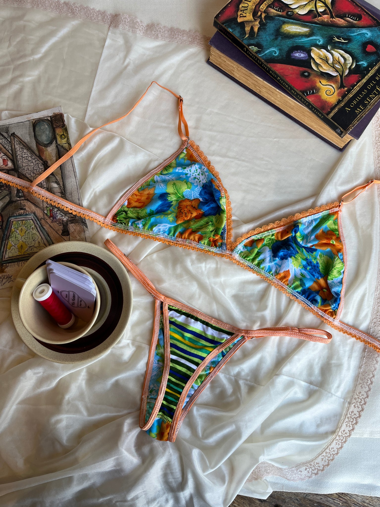 This handmade bra will teleport you to your favorite summertime paradise <3 Admire its gorgeous print in a triangle shape made with super-soft fabric. Fits approximately 75C. Pairs perfectly with the Tropical Thong.